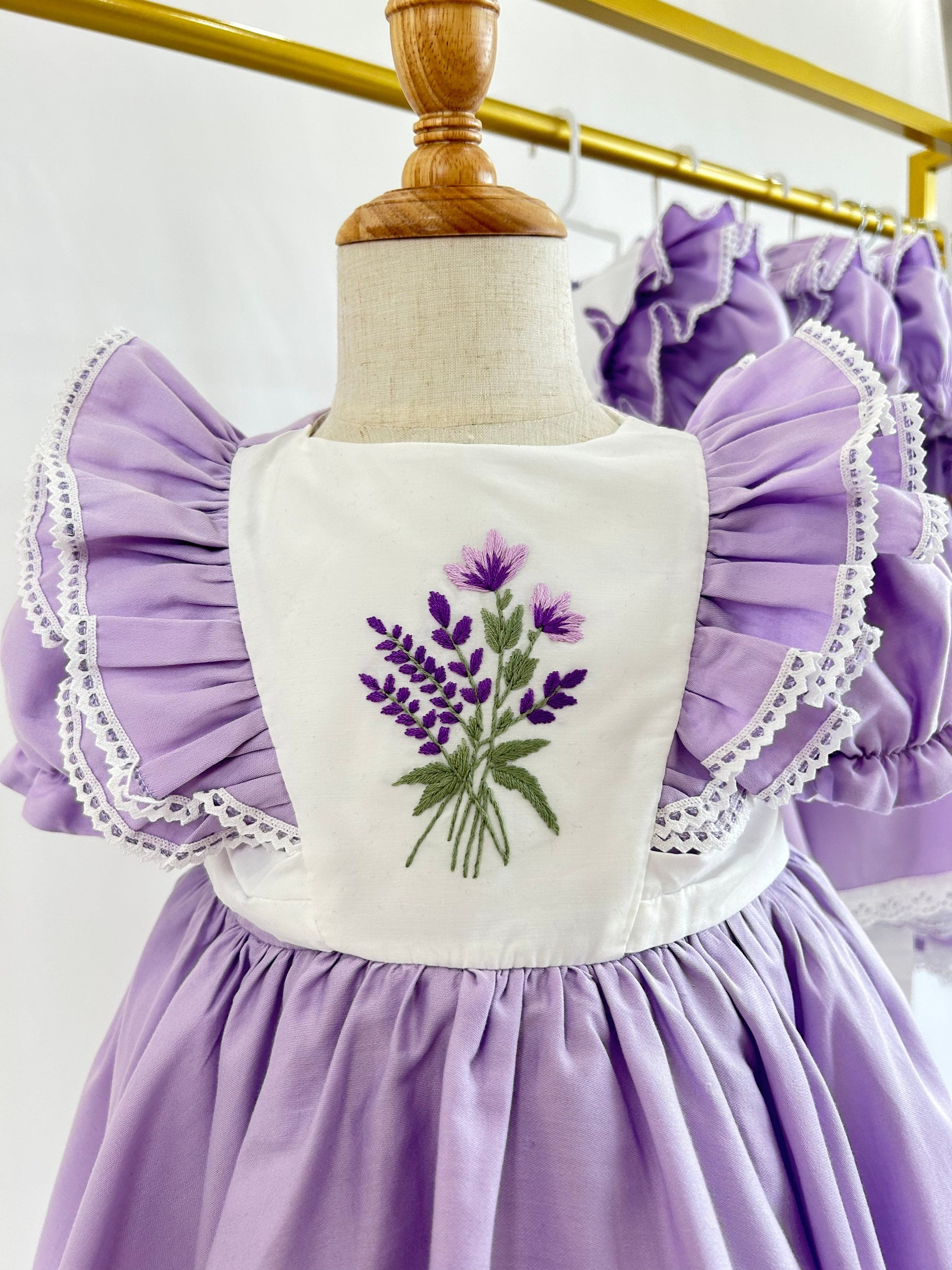 This beautiful lilac ruffle ,short puff-sleeve dress is made of 100% cotton fabric.